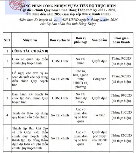 Giai đoạn chuẩn bị đã được triển khai từ tháng 9/2025 đến tháng 1/2026, bao gồm các công việc như giao cơ quan lập quy hoạch, rà soát nội dung cần điều chỉnh, ban hành kế hoạch tổ chức thực hiện, thành lập Ban Chỉ đạo và phê duyệt dự toán kinh phí.