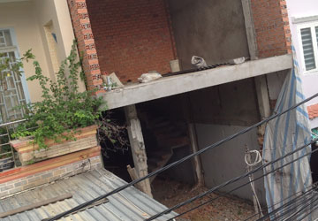 Trong khi hai căn nhà kế bên không bị trừ mét nào thì căn nhà đang xây dở bị quận “chặt” 50 m2 đất. Ảnh: CT