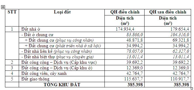 Cơ cấu sử dụng đất của toàn khu sau điều chỉnh quy hoạch:
