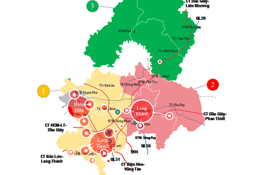 Các đô thị mở rộng liên tỉnh: Bao gồm chuỗi đô thị kết nối Bình Phước – Đồng Nai – Bà Rịa Vũng Tàu, mở ra hành lang phát triển mới vượt khỏi phạm vi một tỉnh.