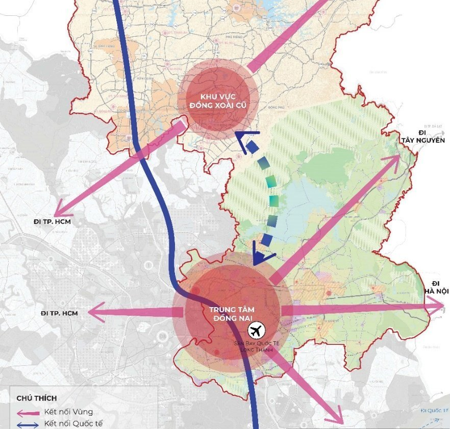 Long Thành – cực tăng trưởng sân bay quốc tế: Hình thành trung tâm công nghiệp – logistics – dịch vụ quy mô vùng, kết nối trực tiếp với Cảng hàng không quốc tế Long Thành.