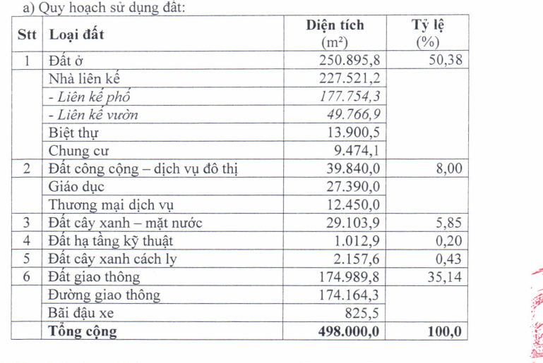 Đất xây dựng nhà ở với tổng diện tích khoảng 250.895,8m2, gồm các loại hình: Nhà liên kế phố, diện tích khoảng 177.754,3m2 gồm 1.608 lô đất với mật độ xây dựng < 80%, tầng cao xây dựng 02 - 03 tầng; Nhà liên kế vườn, diện tích khoảng 49.766,9m2 gồm 470 lô đất với mật độ xây dựng < 80%, tầng cao xây dựng 02 tầng; Biệt thự diện tích khoảng 13.900,5m2 gồm 50 lô đất với mật độ xây dựng < 70%, tầng cao xây dựng 03 tầng; Chung cư diện tích khoảng 9.474,1m2 với mật độ xây dựng < 50%, tầng cao xây dựng 10 tầng.