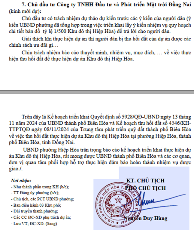 UBND phường Hiệp Hòa sẽ có giấy mời cụ thể đến đại diện những người sử dụng đất có đất thu hồi tham gia để nắm các thông tin liên quan đến công tác bồi thường, hỗ trợ, tái định cư của dự án. Địa điểm tổ chức họp dân để triển khai tại Hội trường Chùa Tỉnh Hội, đường Đỗ Văn Thi, khu phố Nhất Hòa, phường Hiệp Hòa.