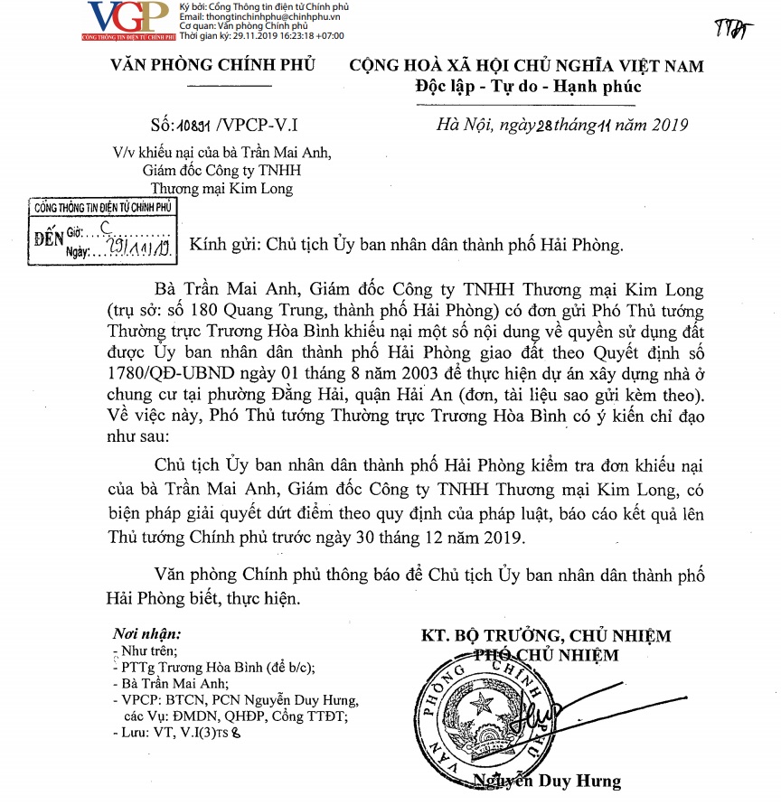 Về việc này, Phó Thủ tướng giao Chủ tịch UBND thành phố Hải Phòng kiểm tra đơn khiếu nại của bà Trần Mai Anh, Giám đốc Công ty TNHH Thương mại Kim Long, có biện pháp giải quyết dứt điểm theo quy định của pháp luật, báo cáo kết quả lên Thủ tướng Chính phủ trước ngày 30/12/2019.
