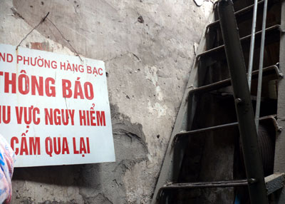 Cũng căn nhà này, năm ngoái đã xảy ra một vụ cháy trên gác hai, UBND phường Hàng Bạc đã treo biển cảnh báo nguy hiểm ở ngay cầu thang lên. Nhưng, trèo lên cây cầu thang ọp ẹp bằng sắt, chúng tôi vẫn thấy một ngăn nhỏ cho một hộ gia đình sinh sống, một đầu kê đệm ngủ, một đầu là vòi nước rửa ráy, nấu nướng. Cuộc sống vẫn diễn ra bình thường.