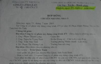 Tuy nhiên, trong bản hợp đồng này có một chi tiết rất tréo ngeo ở chỗ: Ngày Hợp đồng chuyển nhượng nhà ở giữa hai bên là ngày 23/7/2005, nhưng ở con dấu của Công ty 475 xác nhận ở cuối các hợp đồng này (ở vòng đường viền) lại có dòng chữ “TP. Hà Tĩnh” (trong khi đó năm 2007 TP. Hà Tĩnh mới được thành lập, còn trước đó là Thị xã Hà Tĩnh).