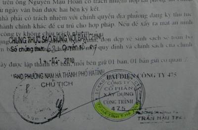 Còn ở con dấu của Công ty 475 đóng ở phía dưới hợp đồng (ở vòng viền phía ngoài) có chữ "TP. Hà Tĩnh" (trong khi năm 2007, TP Hà Tĩnh mới được thành lập)