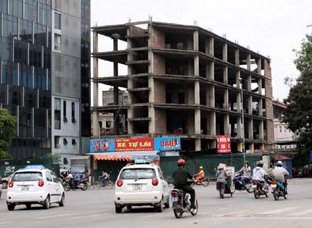 Một công trình xây dựng bị bỏ hoang hơn 10 năm tại ngã tư Đội Cấn - Văn Cao - Liễu Giai, phường Cống Vị, quận Ba Đình (Hà Nội). Ảnh: Tuấn Anh - TTXVN