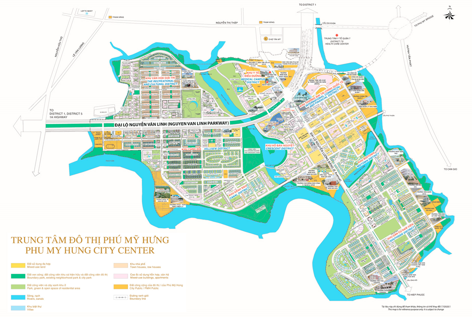 Khu The Crescent (Khu CR): Thiết kế hình cánh cung ven Hồ Bán Nguyệt, nổi bật với phố dạo bộ dài 700m và cầu Ánh Sao độc đáo. Tập trung các tiện ích cao cấp như Crescent Mall, Crescent Residence.