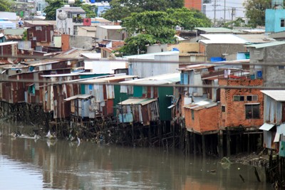 Dọc bờ rạch Hiệp Ân rất nhiều căn nhà có nguy cơ bị lún, sập bất ngờ. Ảnh: VGP/Đỗ Cường