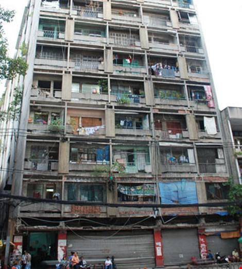 Chung cư số 727 đường Trần Hưng Đạo nằm cách chợ Bến Thành chừng 2km. Tòa nhà 13 tầng này đã hơn 50 tuổi.