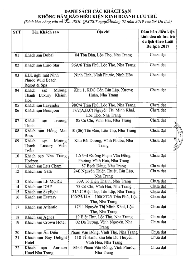 Theo Sở Du lịch Khánh Hòa, các cơ sở kể trên không đảm bảo một hoặc các điều kiện, như: An toànxây dựng, phòng cháy chữa cháy, an ninh trật tự, môi trường, an toàn thực phẩm… theo quy định của Luật du lịch 2017.