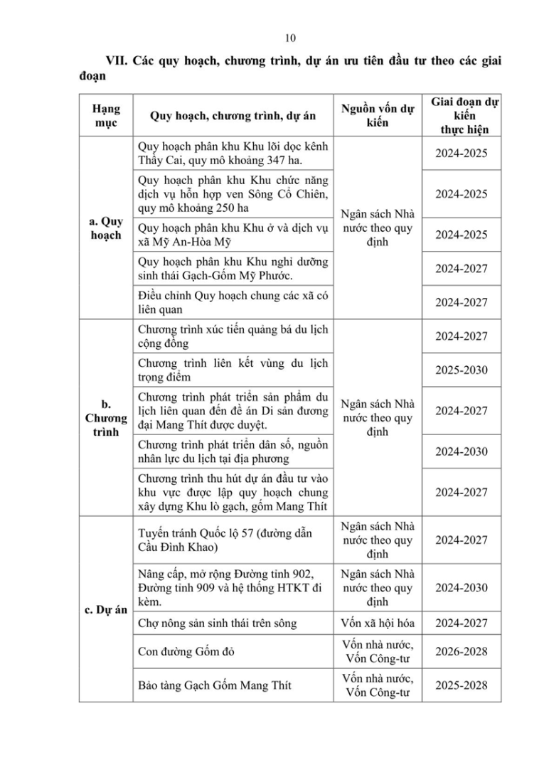 bố trí các khu neo đậu dọc các tuyến kênh Thầy Cai, rạch Cái Nhum, sông Phú Thuận, sông Hòa Mỹ, sông Cây Sộp, sông Cái Mới để khai thác các dịch vụ ngắm cảnh, trải nghiệm du lịch miệt vườn…