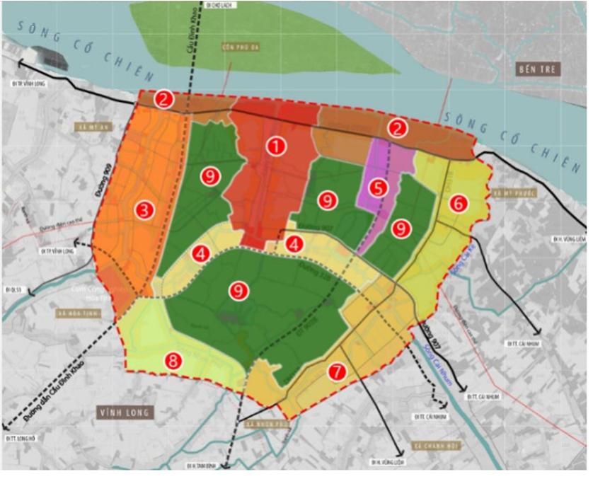 Cơ cấu phát triển không gian khu quy hoạch lấy vùng lõi dọc kênh Thầy Cai làm trung tâm, các khu chức năng gắn với các trục đường chính Đường tỉnh 902, Đường tỉnh 909, Đường tỉnh 907 nối kết từ vùng lõi dọc kênh Thầy Cai đến trung tâm thành phố Vĩnh Long, trung tâm huyện Mang Thít, trung tâm huyện Long Hồ, trung tâm huyện Vũng Liêm, trung tâm huyện Chợ Lách; phát triển khu vực dân cư nông thôn mở rộng về phía Tây và phía Đông Nam, tạo vành đai – vùng đệm sinh thái nông nghiệp bao quanh khu vùng lõi.