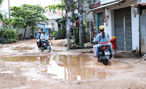 Ít ai ngờ rằng hiện các khu dân cư trong thành phố vẫn còn rất nhiều con đường “đau khổ”, không chỉ ảnh hưởng đến nhu cầu đi lại mà còn trở nên nhếch nhác. Như đường số 3 (P.Bình Hưng Hòa, Q.Bình Tân), nhiều năm nay trở thành nỗi khổ sở của người dân. Chỉ dài khoảng 3km, nhưng có hàng trăm ổ gà, ổ voi, có cái sâu gần tới đầu gối. Hôm chúng tôi đến, dù mới trải qua một cơn mưa nhỏ, nhưng không thể phân biệt được đây là đường hay là sông. Người đi đường phải lách qua trái, đi cả vào lề đường nhưng vẫn không thoát được các hố nước sâu. Đây là khu dân cư đang được hình thành và phát triển khá nhanh, các xe chở vật liệu xây dựng thường xuyên ra vào khiến tình trạng càng trở nên tệ hại hơn. “Nhiều năm qua, chúng tôi đã phản ánh rất nhiều về tình trạng xuống cấp của con đường này. Đến nay dù đã có quyết định làm đường, nhưng không hiểu sao vẫn chưa được triển khai. Người dân lưu thông qua đây chẳng khác gì các tay đua xe địa hình cả” - anh Nguyễn Văn Tùng bức xúc.