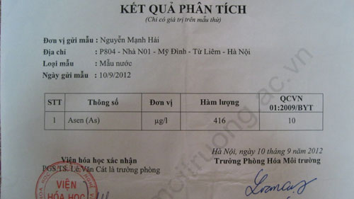 Trong một lần vô tình đem mẫu nước đi xét nghiệm, một hộ gia đình đã nhận được kết quả cho thấy hàm lượng Asen gấp 37 lần mức cho phép. Quá hoảng sợ và bất ngờ, nhiều gia đình tiếp tục lấy mẫu nước tại gia đình đi xét nghiệm và đều cho kết quả nhiễm Asen ở mức cao. Cá biệt, ngày 10/9 anh Nguyễn Mạnh Hải (Phòng 804 – NO1) gửi mẫu nước đi xét nghiệm thì nhận được kết quả cao 41,6 lần so với mức cho phép.