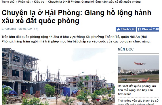 Cụ thể, ngày 27/9/2018 trên Báo Giao thông có bài "Chuyện lạ ở Hải Phòng: Giang hồ lộng hành xâu xé đất quốc phòng" phản ánh trên khu đất quốc phòng rộng 14,2 ha ở khu vực Đồng Xá, phường Thành Tô, quận Hải An (Hải Phòng) có hàng trăm ngôi nhà trái phép mọc lên bất chấp sự vào cuộc của các cơ quan chức năng.