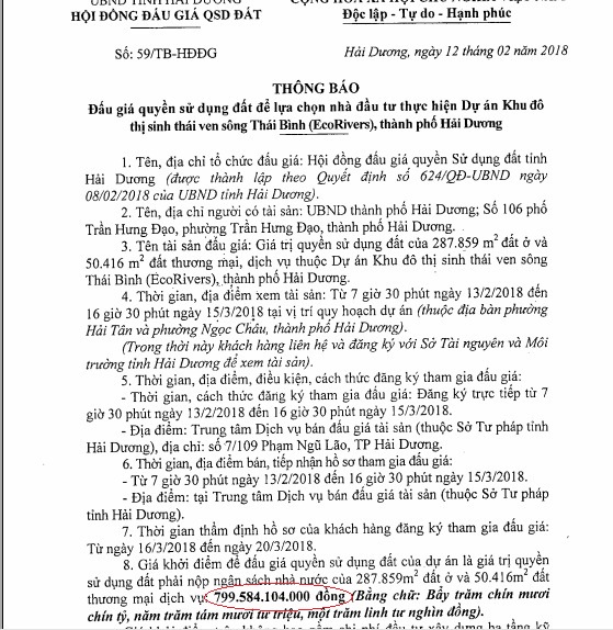 Ngày 12/2, Hội đồng đấu giá quyền sử dụng đất có thông báo số 59/TB-HĐĐG về việc đấu giá quyền sử dụng đất để lựa chọn nhà đầu tư thực hiện dự án khu đô thị EcoRivers.