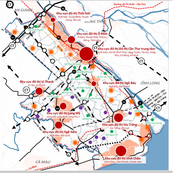 Theo định hướng quy hoạch, hệ thống trung tâm cấp vùng được tổ chức thành 09 khu vực đô thị, gồm: Cần Thơ (trung tâm), Ô Môn, Ngã Bảy, Thốt Nốt, Vị Thanh, Long Mỹ, Ngã Năm, Sóc Trăng và Vĩnh Châu.