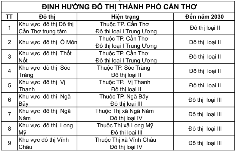 Nhóm 1 – 14 khu vực đô thị tiềm năng, đã có nền tảng dân cư, hạ tầng và hoạt động kinh tế tương đối rõ nét, gồm: Châu Thành, Phú Tâm, Phú Lộc, Lịch Hội Thượng, Vĩnh Viễn, Cờ Đỏ, Địa Ngãi, Long Phú, Thạnh An, Tân Hòa, Kế Sách, Thới Lai, Trần Đề, Phong Điền.