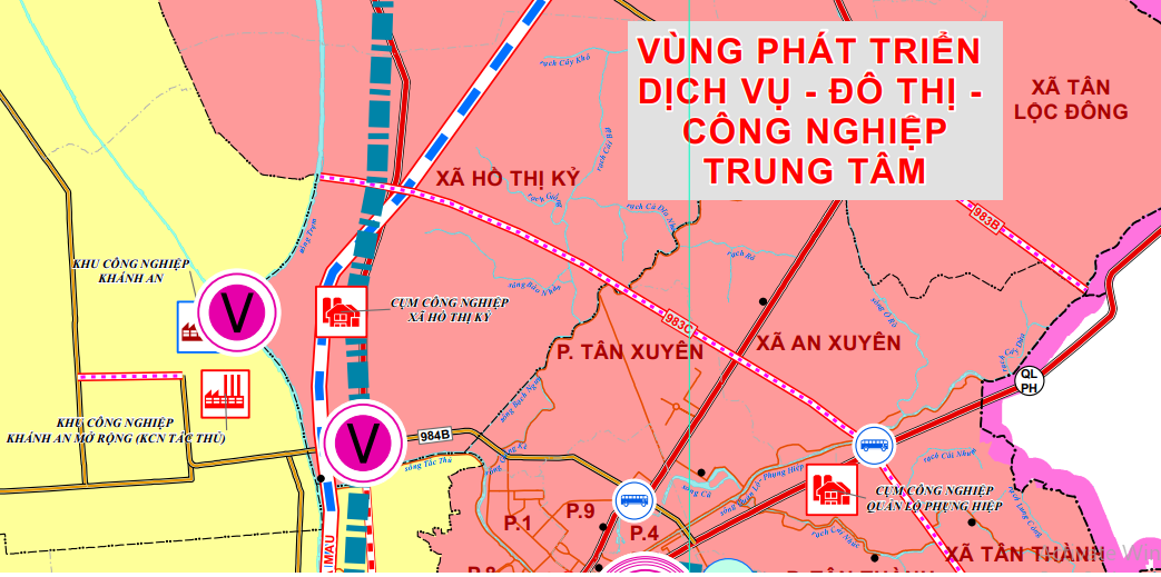 Khu vực phát triển mới: Bố trí đất phát triển cụm công nghiệp Hồ Thị Kỷ (ưu tiên ngành nghề ít ô nhiễm), khu đô thị mới, thương mại - dịch vụ, nhà hàng, khách sạn dọc các trục chính. Tạo điểm nhấn bằng các khu công viên, cây xanh, thể thao, dịch vụ công cộng, kết nối cảnh quan với các tuyến sông lớn (Trèm Trẹm, Tắc Thủ, Bạch Ngưu, Ông Đốc). Đồng thời bổ sung cửa hàng xăng dầu, trạm sạc điện và các cửa hàng tiện ích.