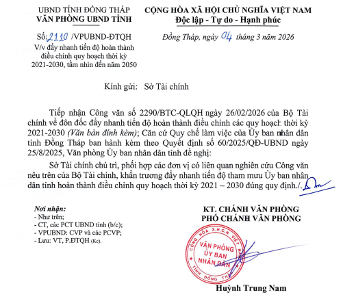 Theo Công văn số 2110/VPUBND-DTQH ngày 03/3/2026 và Công văn số 2140/VPUBND-ĐTQH ngày 04/3/2026, Văn phòng UBND tỉnh Đồng Tháp đã tiếp nhận Công văn số 2290/BTC-QLQH ngày 26/02/2026 từ Bộ Tài chính, nhằm đôn đốc đẩy nhanh tiến độ hoàn thành điều chỉnh các quy hoạch thời kỳ 2021-2030. Căn cứ Quy chế làm việc của UBND tỉnh ban hành kèm Quyết định số 60/2025/QĐ-UBND ngày 25/8/2025, Văn phòng đề nghị Sở Tài chính chủ trì, phối hợp các đơn vị liên quan khẩn trương nghiên cứu nội dung từ Bộ Tài chính. Mục tiêu là tham mưu UBND tỉnh hoàn thành điều chỉnh quy hoạch đúng quy định, góp phần thúc đẩy phát triển bền vững của tỉnh.
