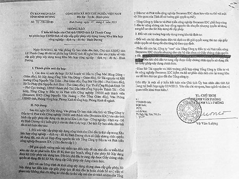 Phóng viên đưa ra một số vấn đề, trong đó có việc UBND thành phố TDM cấp nhiều GPXD “tạm” tại “thành phố mới”. Kỹ sư Bảy thừa nhận việc đó chưa đúng, nhưng do nhu cầu người dân quá lớn, UBND tỉnh đã chỉ đạo bằng văn bản nên Phòng QLĐT tham mưu đề xuất UBND thành phố TDM cấp trên dưới 100 GPXD “tạm”. Phóng viên đề nghị cho xem văn bản này. Sau khi điện thoại xin ý kiến lãnh đạo, kỹ sư Bảy mới chịu cung cấp Văn bản số 72/TB-UBND của UBND tỉnh Bình Dương do Phó chánh văn phòng Võ Văn Lượng ký ngày 15-4-2013, truyền đạt ý kiến chỉ đạo của Chủ tịch UBND tỉnh Lê Thanh Cung. Trong đó nêu rõ, ngày 1-4-2013, Chủ tịch UBND tỉnh Lê Thanh Cung chủ trì phiên họp nghe báo cáo xin ý kiến về việc cấp GPXD trong Khu liên hợp công nghiệp - dịch vụ và đô thị Bình Dương. Tham dự có Giám đốc Sở KH - ĐT Mai Hùng Dũng, Giám đốc Sở XD Trần Văn Dũng, hai Phó giám đốc Sở TN - MT Nguyễn Văn Toàn, Bùi Văn Hai, Phó giám đốc Sở Tư pháp Nguyễn Anh Hoa, Phó cục trưởng Cục Thuế tỉnh Huỳnh Đình Trí, Chủ tịch UBND thành phố TDM Nguyễn Thành Tài, Phó tổng giám đốc Becamex Nguyễn Văn Hoàng, đại diện Văn phòng UBND tỉnh...