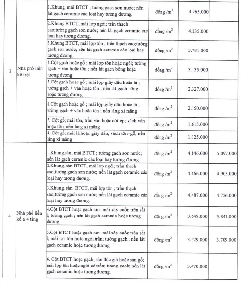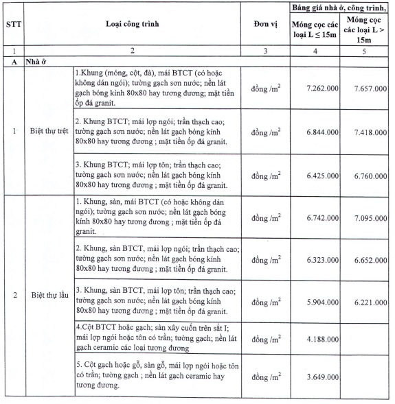 Giá trị xây dựng nhà ở, công trình, vật kiến trúc không có trong Bảng giá này thì áp dụng theo suất vốn đầu tư xây dựng công trình và giá xây dựng tổng hợp bộ phận kết cấu công trình được Bộ Xây dựng công bố.