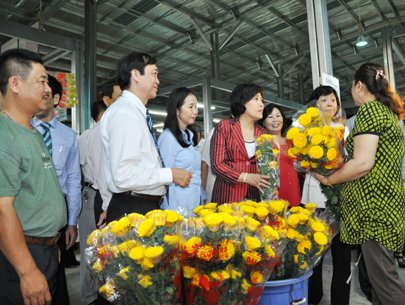 | Bà Nguyễn Thị Hồng, Phó chủ tịch UBND TPHCM (áo đỏ) thăm khu vực kinh doanh hoa tươi tại chợ đầu mối nông sản thực phẩm Bình Điền hôm khai trương 5-2. Đây là các quầy sạp từ chợ Hậu Giang di dời về. Ảnh: Chương Anh |