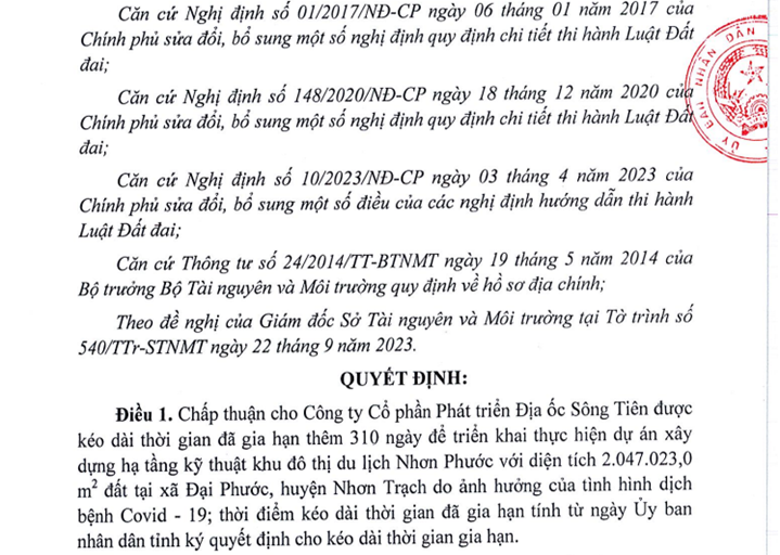 Cụ thể, UBND tỉnh Đồng Nai vừa có quyết định chấp thuận cho Công ty CP Phát triển Địa ốc Sông Tiên được kéo dài thời gian đã gia hạn thêm 310 ngày để triển khai thực hiện dự án xây dựng hạ tầng kỹ thuật Khu đô thị du lịch Nhơn Phước.