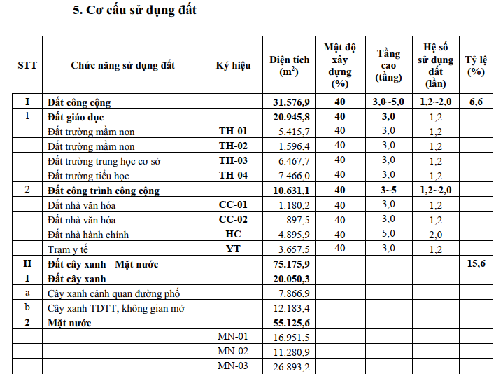 Đất nhà ở liền kề (ký hiệu lô đất từ LK-01 đến LK-38): Được bố trí bám các tuyến đường giao thông khu vực. Chỉ tiêu quy hoạch như sau: Tầng cao 03-05 tầng, mật độ xây dựng 70-90%, hệ số sử dụng đất 4,0 lần.