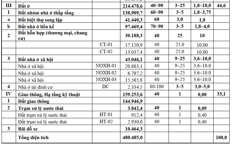 Đất tái định cư (ký hiệu lô đất DC): Được bố trí tại phía Nam, giáp khu vực bố trí đất nhà ở xã hội. Chỉ tiêu quy hoạch như sau: Tầng cao công trình 03-05 tầng, mật độ xây dựng 80-100%, hệ số sử dụng đất 3,0-5,0 lần.