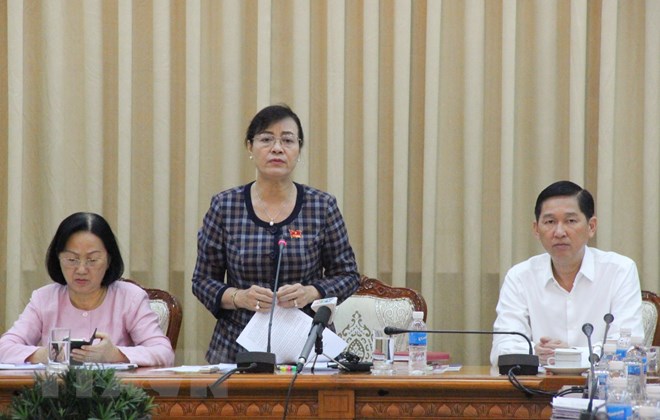 Bà Nguyễn Thị Quyết Tâm, Phó Bí thư Thành ủy, Chủ tịch Hội đồng nhân dân Thành phố Hồ Chí Minh phát biểu tại buổi làm việc. (Ảnh: Xuân Dự/TTXVN)