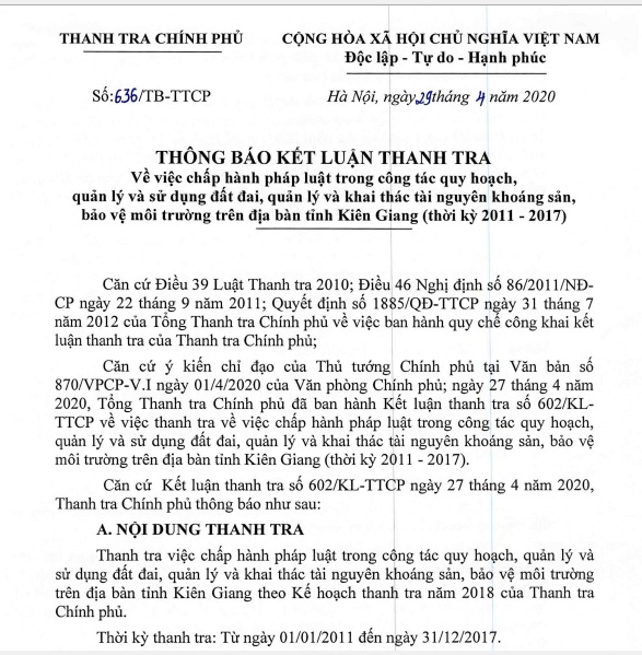 Trước những sai phạm trên, Tổng Thanh tra Chính phủ kiến nghị Thủ tướng Chính phủ chỉ đạo Chủ tịch UBND tỉnh Kiên Giang thực hiện những việc sau: