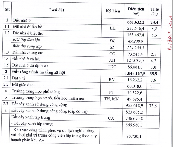 Trong đó, đất ở có diện tích khoảng 681.632 m², chiếm khoảng 23,4% tổng diện tích khu quy hoạch.