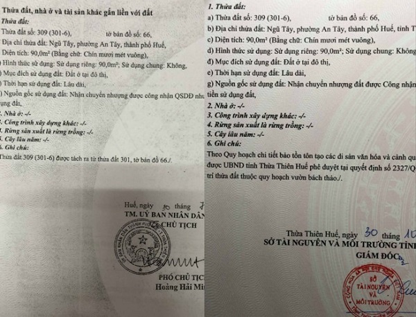 Chia sẻ với PV, năm 2018, ông Hoàng Trọng T. và vợ (trú đường La Sơn Phu Tử, phường Tây Lộc, TP. Huế) nhận chuyển nhượng quyền sử dụng đất, thửa đất số 309 (301-6), tờ bản đồ số 66, phường An Tây (TP. Huế); diện tích 90 m2; mục đích sử dụng: đất ở; thời hạn sử dụng đất lâu dài.