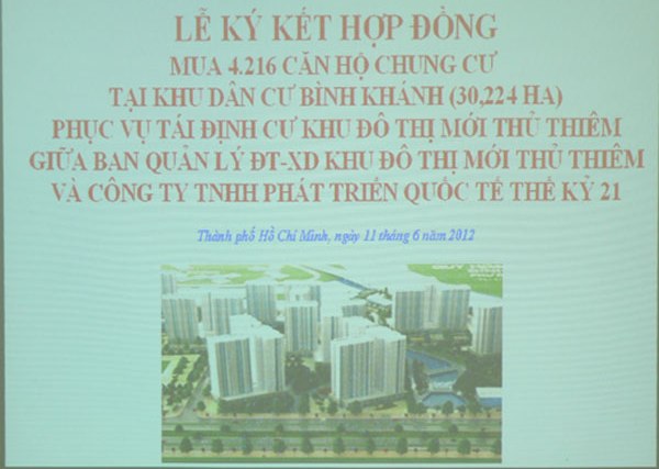 Chương trình xây dựng 12.500 căn hộ tái định cư tại Khu đô thị mới Thủ Thiêm nhằm tái định cư tại chỗ cho các hộ dân thuộc 5 phường trung tâm của khu đô thị này. Dự án bao gồm 3 khu: Khu 30,22ha Bình Khánh (4.216 căn); Khu 38,4ha Bình Khánh (6.220 căn); Khu 17,3ha An Phú - Bình Khánh (1.844 căn). Được biết, 512 căn hộ nằm trong dự án 1.844 căn hộ tái định cư tại phường An Phú - Bình Khánh đã được UBND quận 2 bàn giao cho các hộ dân vào cuối tháng 5/2011.