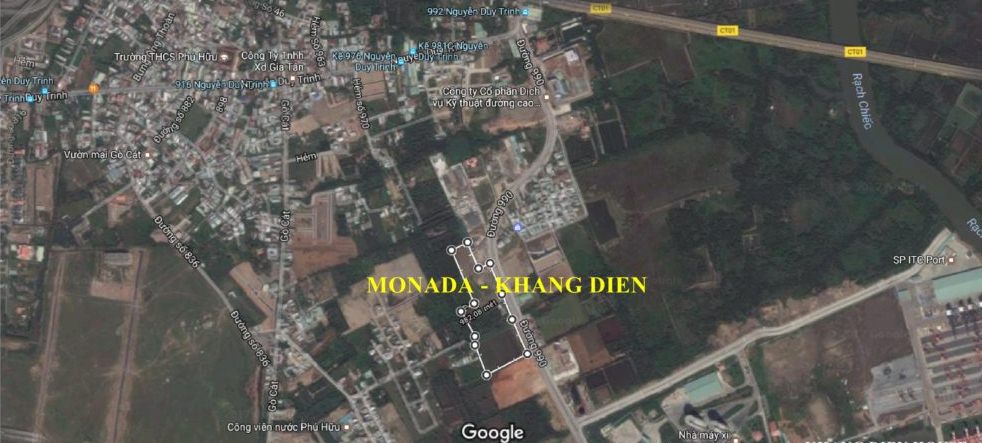 Dự án Khu nhà ở Công ty Kim Phát (Monada Khang Điền) có phía Đông giáp rạch hiện hữu, phía Tây giáp dự án Khu nhà ở Công ty TNHH Đầu tư Nhà Phố và đất trống, phía Nam giáp dự án khu nhà ở Tạp chí Phát triển kinh tế, phía Bắc giáp rạch hiện hữu.