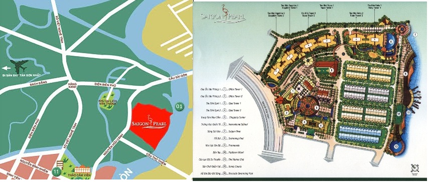 Khu dân cư phức hợp Saigon Pearl có phía Đông giáp đường D10; Phía Đông Nam giáp đường D9; Phía Tây Nam giáp đường D1 (Võ Duy Ninh dự kiến); Phía Tây Bắc giáp đường Nguyễn Hữu Cảnh; Phía Bắc giáp đường D2.