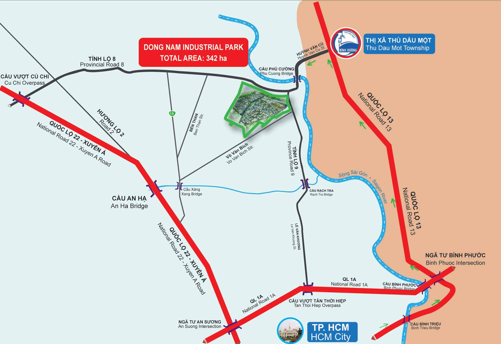 Khu công nghiệp Đông Nam và Khu dân cư thuộc xã Bình Mỹ và xã Hòa Phú, huyện Củ Chi (phần đất nằm ở góc của đường Tỉnh lộ 8, Tỉnh lộ 9 và đường Bến Than). Dự án có phía Đông Nam giáp khu dân cư hiện hữu và đường Võ Văn Bích, phía Đông giáp Tỉnh lộ 9, phía Tây giáp khu dân cư hiện hữu và đường Bến Than, phía Nam giáp đất nông nghiệp và một phần rạch Bà Bếp, phía Bắc giáp Tỉnh lộ 8.
