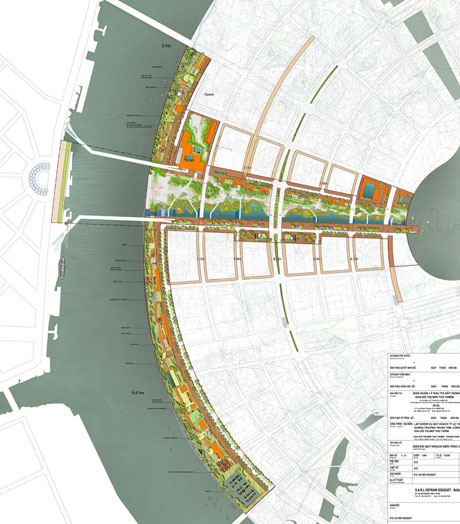 Công viên bờ sông có diện tích khoảng 90.462 m2, bao gồm các loại đất sau: Nền đa năng chiếm khoảng 25% diện tích công viên, Đất cây xanh chiếm khoảng 70% diện tích công viên, Đất xây dựng công trình chiếm khoảng 5% diện tích công viên. Mật độ xây dựng tối đa 5%. Tầng hầm phải đảm bảo diện tích cho bãi đậu xe công cộng với quy mô tối thiểu là 187 chỗ đậu ô tô.