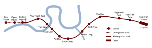 3 ga ngầm là Bến Thành, Nhà hát Thành phố và Ba Son; 11 ga còn lại là ga trên cao: Văn Thánh, Cầu Sài Gòn, Thảo Điền, An Phú, Rạch Chiếc, Phước Long, Bình Thái, Thủ Đức, Khu Công nghệ cao, Suối Tiên, Bến xe Miền Đông mới. Ngoài ra còn có 1 ga Depot là Depot Long Bình.
