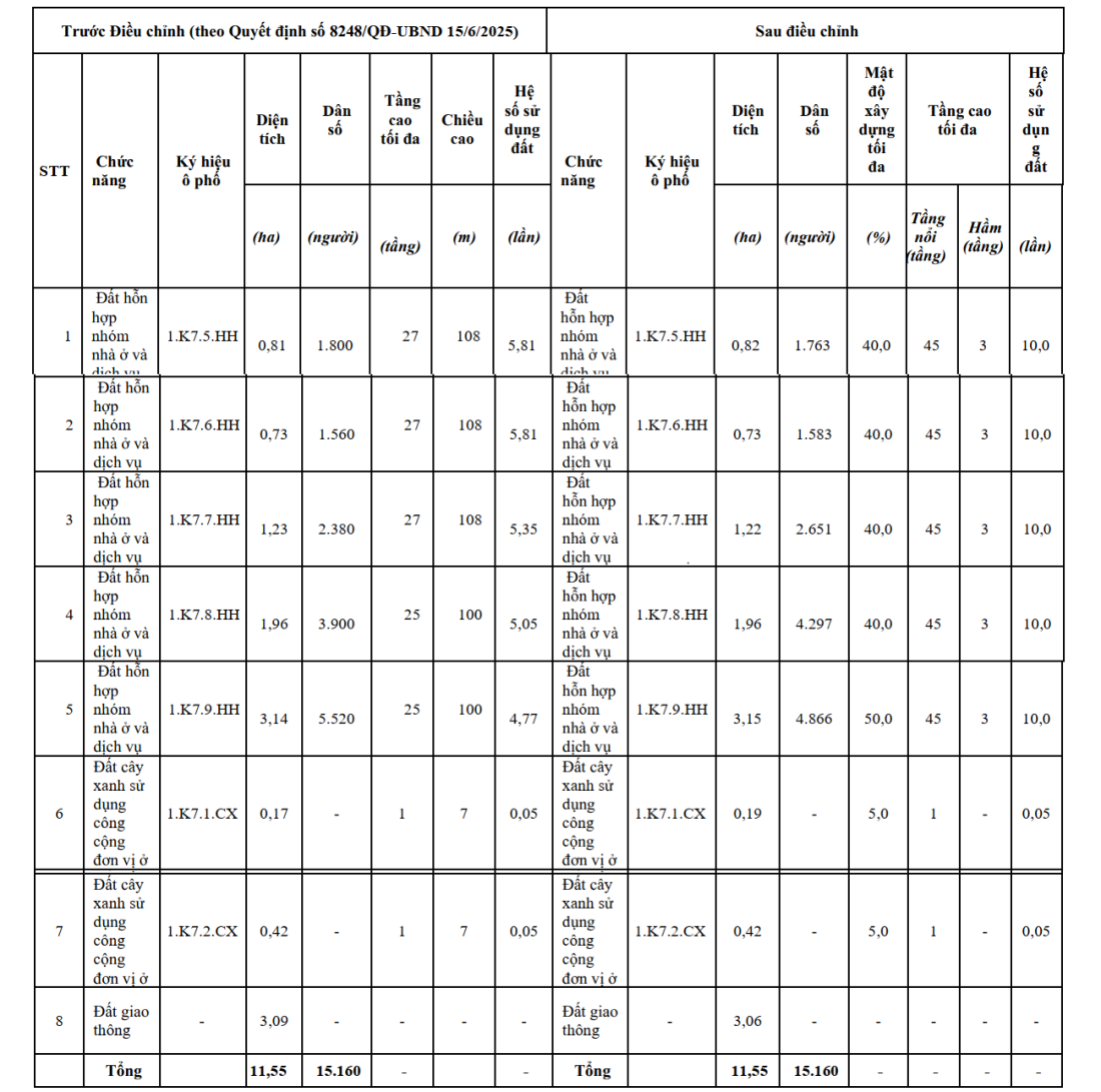 Các chỉ tiêu quy hoạch kiến trúc trước và sau điều chỉnh.