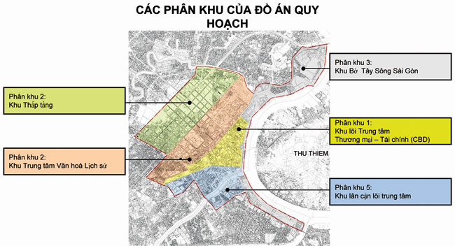 Cũng theo đồ án, Khu trung tâm hiện hữu TP.HCM được quy hoạch thành 5 phân khu chức năng bao gồm: Khu lõi trung tâm thương mại - tài chính; Khu trung tâm văn hóa - lịch sử; Khu bờ Tây sông Sài Gòn; Khu thấp tầng và Khu lân cận lõi trung tâm. Cụ thể như sau: