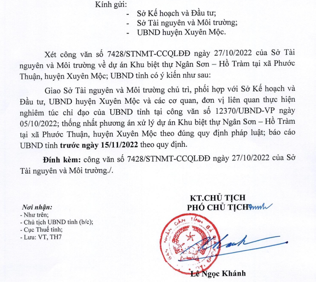 Cụ thể, xét công văn số 7428/STNMT-CCQLĐĐ ngày 27/10/2022 của Sở Tài nguyên và Môi trường về dự án Khu biệt thự Ngân Sơn - Hồ Tràm tại xã Phước Thuận, huyện Xuyên Mộc, UBND tỉnh có ý kiến: