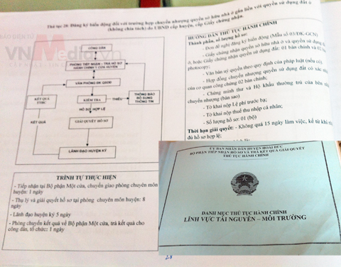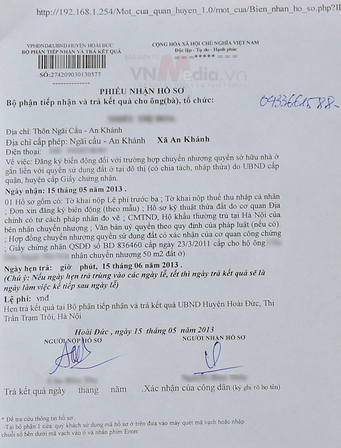 Theo phản ánh của chị Minh Thủy (xã Kim Chung) đầu tháng 1/2013, chị nộp hồ sơ tại Bộ phận 1 cửa của UBND huyện Hoài Đức và nhận được giấy hẹn 1 tháng trả kết quả, dù theo quy định công khai của UBND huyện Hoài Đức ngay tại Bộ phận này, thời gian trả kết quả “không quá 15 ngày”. Đúng 1 tháng sau, chị được hướng dẫn nhận lại hồ sơ để đi nộp lệ phí trước bạ và khi hoàn thành việc nộp phí, quay trở lại nộp hồ sơ ở Bộ phận 1 cửa thì lại tiếp tục nhận được phiếu hẹn 1 tháng trả kết quả nhưng tới nay đã quá thời gian mà vẫn chưa có thông tin nào.