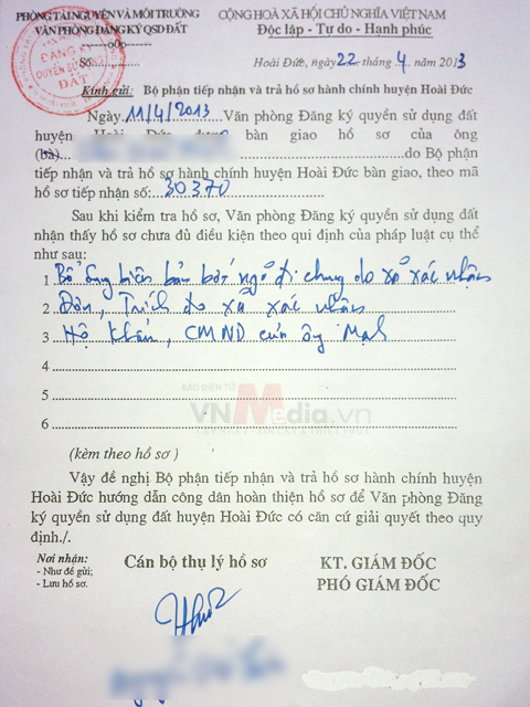 Trường hợp anh Nam ở xã Vân Canh (qua UBND xã) đã nộp đầy đủ hồ sơ cho cán bộ tên H. ở Phòng Tài nguyên và môi trường huyện Hoài Đức từ tháng 2/2013 tới nay nhưng chưa được giải quyết và điệp khúc “10 ngày nữa” được vị cán bộ liên tục nhắc lại.