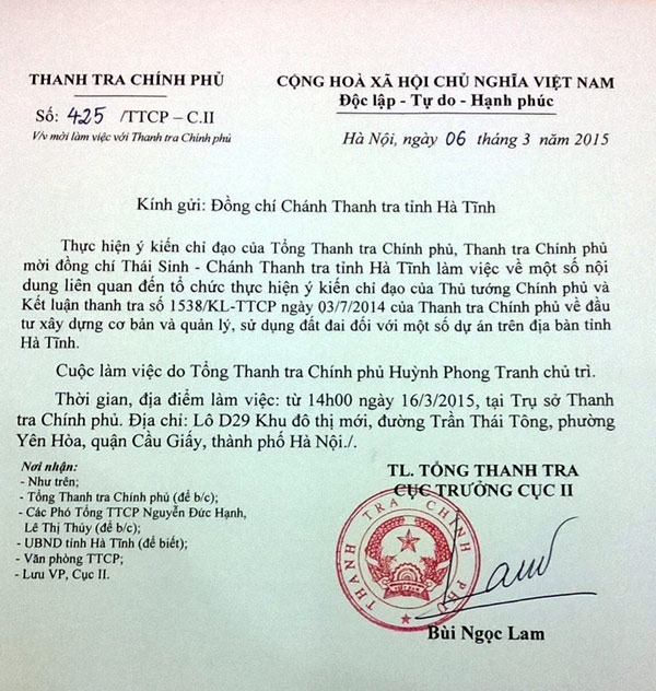 TTCP vừa có giấy mời đích danh ông Thái Sinh, Chánh Thanh tra tỉnh Hà Tĩnh về Hà Nội làm việc vào chiều 16-3 tới đây tại trụ sở TTCP về một số nội dung liên quan đến tổ chức thực hiện ý kiến chỉ đạo của Thủ tướng Chính phủ và Kết luận thanh tra số 1538/KL-TTPC ngày 3-7-2014 của TTCP về đầu tư xây dựng cơ bản và quản lý, sử dụng đất đai đối với một số dự án trên địa bàn tỉnh Hà Tĩnh.