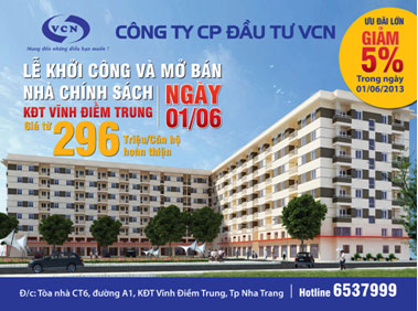 CafeLand - Ngày 01/06 tới, Công ty Cổ phần Đầu tư VCN tổ chức lễ khởi công và mở bán nhà chính sách thuộc Khu đô thị Vĩnh Điềm Trung, thành phố Nha Trang với mức giá từ 296 triệu đồng/căn hộ hoàn thiện.