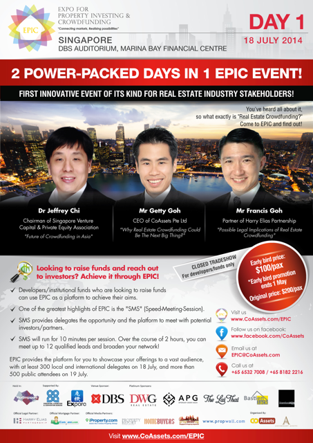 CafeLand - Từ ngày 18 – 19/7 tới, Sàn huy động vốn công chúng cho bất động sản CoAssets sẽ tổ chức triển lãm về đầu tư bất động sản và huy động vốn từ công chúng cho bất động sản (EPIC) tại sảnh hội nghị DBS tại Marina Bay Financial Centre, Singapore.